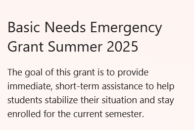 The Basic Needs Committee has Emergency Grant funding available to help you stay enrolled! The goal is to provide immediate, short-term assistance to help students directly stabilize their situation and continue on their journey of educational success.
