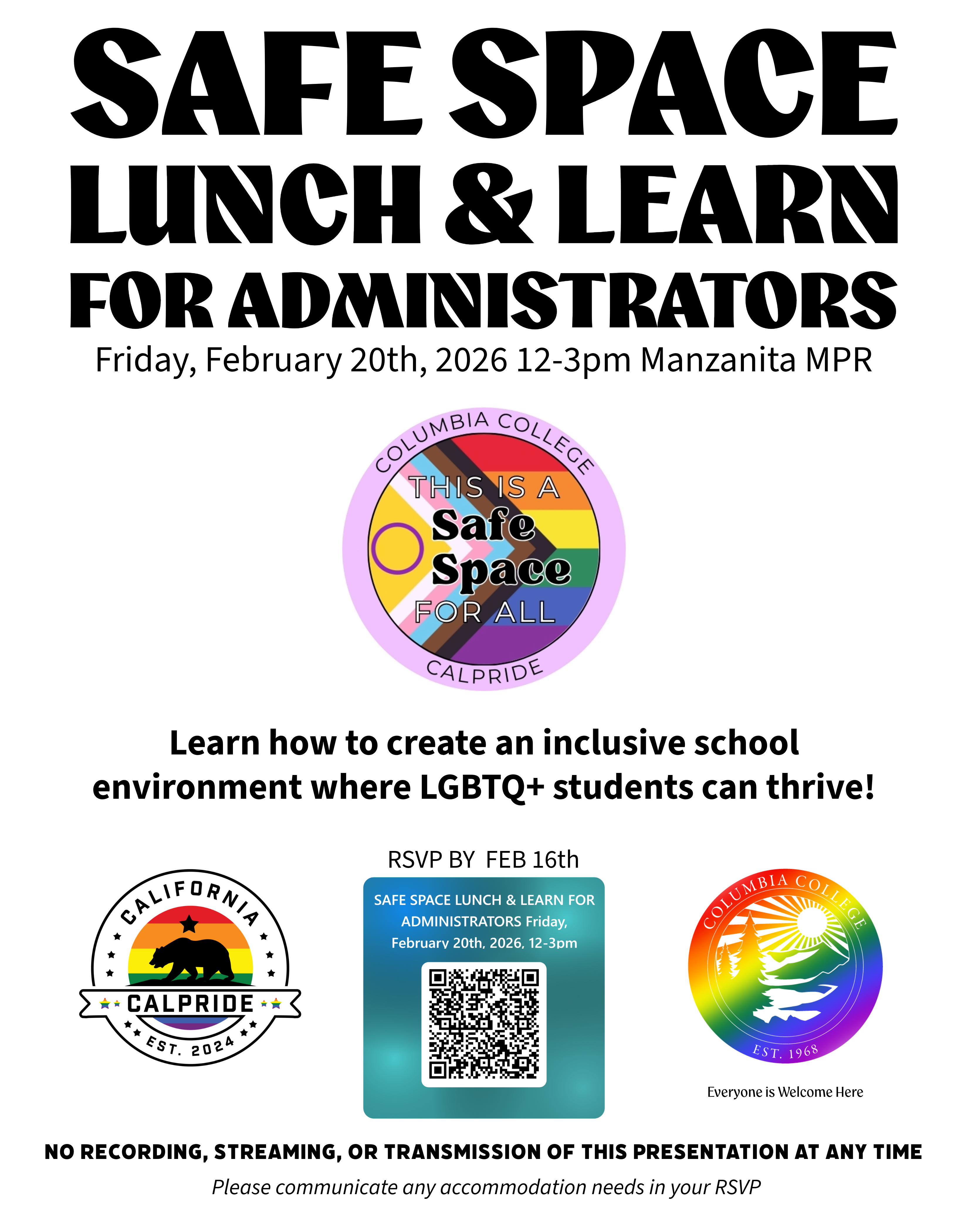 Columbia College, in partnership with Cal Pride, offers annual Safe Space training for staff, administration, and students with the goal of creating an inclusive school environment where LGBTQ+ students can thrive.